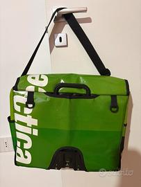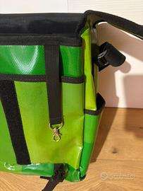 È impermeabile, dotata di due ali interne per proteggere ulteriormente il contenuto. Viene venduta con l’apposito aggancio specifico per biciclette Brompton. Modello Diagonal Mar.