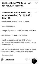 Come nuova, usata una sola volta.La borsa da manubrio Vaude OnTour Box ha una capacità di 6 litri, per poter organizzare I'attrezzatura che devi avere a portata di mano per le uscite o i giri in bicicletta di più giorni. La sua copertura antipioggia protegge i tuoi oggetti dalle intemperie.