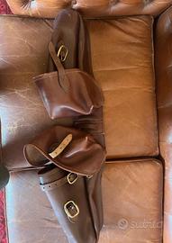 Stupendo esemplare di borsa da bicicletta fatta da un sellaio toscano composta da doppia sacca laterale 35 x 20 di forma triangolare con chiusura e fibbie di regolazione. Banda in pelle che congiunge le due parti e staffe metalliche per assicurare la borsa al portapacchi.