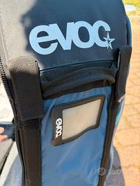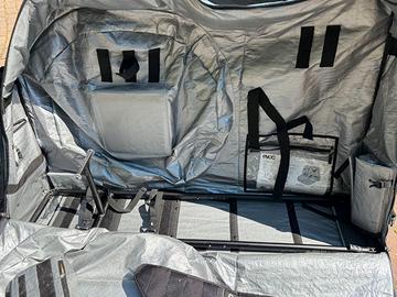 Borsa valigia portabici EVOC come nuova. Per trasportare in sicurezza biciclette da corsa, gravel o da triathlon. Con supporto metallico per attaccare i mozzi del telaio nella base della valigia, e borse laterali per inserire le ruote. Con busta porta attrezzi. E spazio per casco e scarpette. Si trasporta con le rotelle. Perfetta per i lunghi viaggi in aereo o in treno