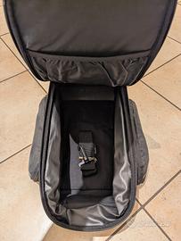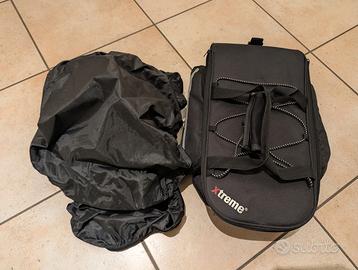 due sacche laterali integrate e apribili al bisogno, completa di custodia antipioggia e fascia tracolla.