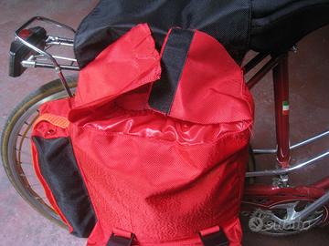due borse da viaggio posteriori per bici, impermeabili 100%, tessuto Cordura resistentissimo, esterno ruvido e interno liscio, massima visibilità in strada, catarifrangenti posteriori, perfette condizioni, usate una volta, made in italy.