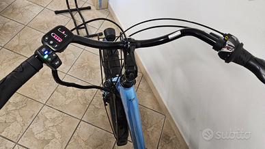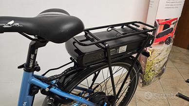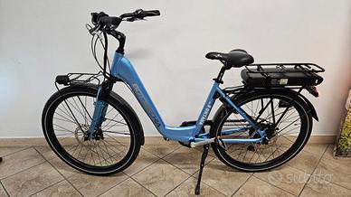 City bike elettrica a pedalata assistita, telaio in alluminio, ruote da 26", freni a disco e forcella ammortizzata. Particolarmente adatta a persone di medio-bassa statura.