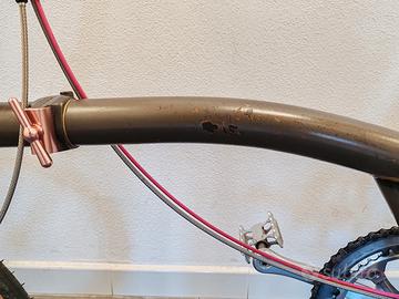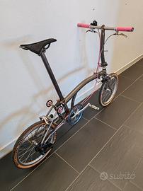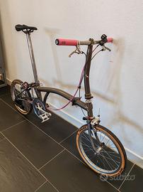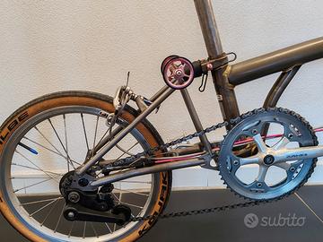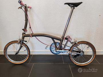 Brompton Superlight raw lacquer. Carro posteriore e anteriore in titanio. Modello 2014 Telaio trattato con trasparente antiruggine per lasciare i "difetti estetici" presenti in stile rat style, Bici perfetta per gli spostamenti in città Pesa 8.3 kg. Praticamente quasi come la versione in titanio. Presenta numerose modifiche/up grade importanti e componentistica Nuova in Titanio e carbonio. 4 marce Attualmente Monta corona anteriore durace 52..42 Tubo Sella Brompfication Titanio Sellino in carbonio con stampa 3D Manubrio Titanio Leve freno cnc extra light Manopole nuove Cavi e guaine nuovi Copertoni Schwalbe kojak nuovi Pedali ultralight aceoffix con sgangio rapido Sgancio rapido Tubo sella in cnc rosa Insieme alla bici numerosi ricambi originali. Per qualsiasi dettaglio scrivete pure qui o via whattsup. Valuto permuta con bici touring o con cargo bike.