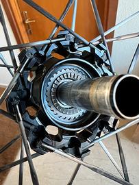Ruote tenute sempre molto bene, hanno circa 10mila km all’attivo e normali segni di usura. Dotate di corpetto sram XDR (completamente revisionato) e tubolari Tufo da 28mm (quello posteriore nuovo di zecca mai usato mentre quello anteriore circa a metà vita). Vendo senza dischi.