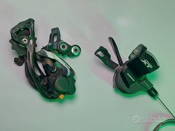 Vendo in abbinata cambio Shimano XTR mod.RD-M986 usato e con segni di utilizzo, Dyna-sys 11 velocità, con comando blocco/sblocco molla, con gabbia in carbonio riparata; oltre a comando cambio Shimano XT mod. SL-M8000, Dyna-sys 11 velocità, con visore e filo, collare 22.2, ottime condizioni.