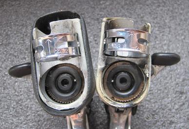 SPEDIZIONE POSSIBILE Coppia di comandi cambio integrati alle leve freno CAMPAGNOLO RECORD a 8 velocità. Versione del 1993 con il corpo della leva in metallo e pratiche piccole viti per regolare la posizione iniziale della leva freno e della levetta del cambio. Condizioni estetiche buone se si considerano i più di 30 anni di età, esattamente come visibile nelle foto sono presenti tipici normali segni d'uso e del tempo. Il gommino coprileva destro è ancora in buone condizioni, mentre il sinistro purtroppo è mancante. Completamente puliti e revisionati, funzionamento e meccanica perfetti, pronti ad essere nuovamente installati. Compatibili con qualsiasi altro gruppo Campagnolo a 8 velocità, sia con guarnitura doppia che tripla. Il costo della spedizione rimarrà lo stesso fino a 3kg di peso, quindi potrebbe essere una buona occasione per aggiungere qualche altro componente. Per qualsiasi domanda 3771266112