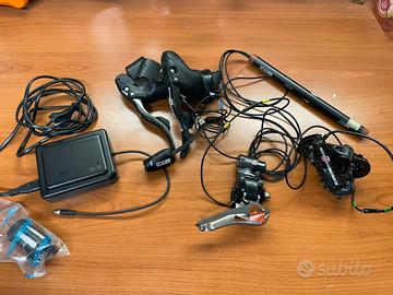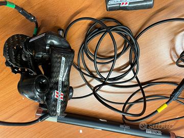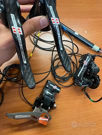 Gruppo campagnolo record 11 velocità, nuovo, montato su bicicletta esposta e mai messa in strada, quindi posso far vedere che funziona tutto, batteria perfetta, compreso braccialetto e carica. A parte posso fornire freni e guarnitura