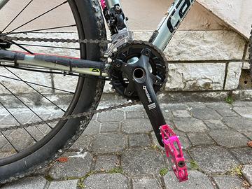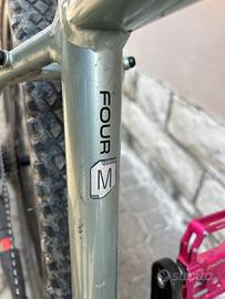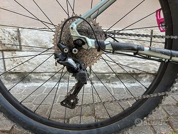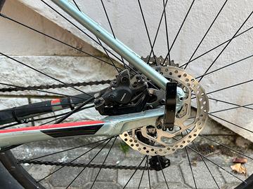 Vendo Cannondale Trail Four taglia M in buone condizioni generali, con normale usura da utilizzo trail. Bici solida e reattiva, adatta a sterrati e single track. Specifiche: •Telaio: alluminio SmartForm C2 Cannondale, colore grigio/verde metallizzato con grafiche arancio/nero, taglia M •Ruote: 29” •Forcella: ammortizzata SR Suntour con remote lockout sul fodero •Pneumatici: Maxxis anteriore + CST Gripper posteriore •Trasmissione: monocorona 1×10 – cambio posteriore Shimano Deore, cassetta 11-42T; guarnitura sostituita con Prowheel Vortex •Freni: Shimano idraulici a disco su entrambe le ruote •Sellino: originale Cannondale con reggisella Cannondale •Pedali: Magped flat in alluminio (rosa/fucsia) – inclusi •Manubrio: flat bar con stem Cannondale Note: Qualche graffietto sul telaio come da foto, niente di strutturale. Bici funzionante e regolarmente manutenzione. Trattativa riservata a persone serie. No spedizione, ritiro a mano in zona cervia .