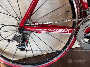 Marca e Modello: Cannondale supersix evo del 2013 Anno di acquisto: 2013 ma usata veramente col contagoccie come si vede dalla bici che e immacolata pari al nuovo Taglia del telaio: la bici va bene x persone alte da 166 a 173 circa Materiale: carbonio alto modulo HM Componentistica Gruppo Cambio: SRAM Red completo 10 velocita guarnitura cannondale red 50-34 con pacco pignoni 11-26 Trasmissione: catena e cassetta sostituite da 500 km Freni: rim Ruote: Marca mavic modello dei cerchi ksirum elite Condizioni Reali e Manutenzione pari al Nuovo Chilometri percorsi: Una stima onesta del chilometraggio totale meno di 3000 km in totale Segni di usura: non esistono difetti se non da una piccola perdita dell'adesivo dei decal dal cerchio ma si possono mettere tranqulillanente nuove con pochi euro Storia della manutenzione pulita e mantenuta con cura come detto e intonsa pari al nuovo