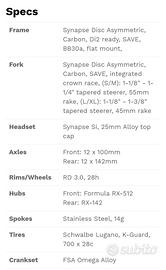 cannondale in carbonio, misura 54. specifiche in foto. include sensore ruota x cannondale app. usata pochissimo vendo per passaggio a bici elettrica. visibile in zona naiadi a Montesilvano. no affaristi o perditempo, grazie.