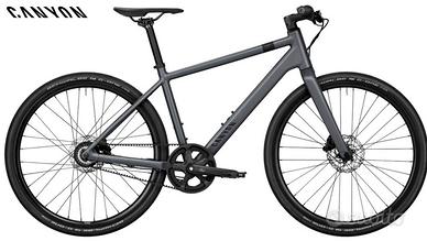 Bicicletta Tg. M ( 168-178 cm.) usata pochissimo ( si e no avrà percorso 30 Km.) colore grigio satinato, forcella rigida in carbonio, cambio Shimano Nexus SG-C6001 Gear Hub con trasmissione a cinghia dentata Gates CDN Belt, freni Shimano MT200/UR300, manopole Ergon GA3 Wing Twist, cockpit in alluminio monoscocca, con design semi-integrato e cavi interni, gomme Schwalbe G-One Allround Performance Race Guard TLE. reggisella originale CANYON in carbonio, borraccia CANYON, Borsello sottosella CANYON, luci anteriori e posteriore, cavalletto laterale in lega leggerissimo, accessoriata con GPS. CAUSA INUTILIZZO