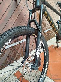 vendo bici canyon nerv all + del 2016,la bici è un telaio L con ruote da 26,davanti monta come ammortizzatore un rock shock reba con 150 di escursione, mentre dietro monta un Fox float con 90 di escursione,come freni monta dei avid 4 pistoncini con pastiglie e dischi freno cambiati da poco,come cerchioni monta dei mavic cross max con copertoni davanti maxxis Minion dhf e dietro maxxis Minion dhr,manubrio e attacco manubrio sono entrambi race face,come sellino telescopico monta un RFR , come cambio monta uno sram.