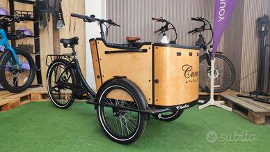 Curvy 36V 250W a motore posteriore (Mozzo) Cassone Marrone - Telaio Alluminio 6061 - Motore Ananda 36V 250 Watt - Coppia max 50 Nm - Velocità massima 25 Kmh - Batteria 16,5 Ah (598 Wh) Samsung / Lg - Cerchi Alluminioa 36 raggi 26 Post - 20 Ant - Pneumatici CST Ant. 20x2.0 - Pneumatici CST Post. 26x2.0 - 3 Freni a disco Idraulici 180 mm - Bengala - Deragliatore: Shimano Tourney a 7 velocità - Pignone Shimano MF-TZ 500-7 V ( 14 - 16 - 18 - 20 - 22 - 28T) -LCD Ananda 5 Livelli di assistenza (Modello grande) - Peso bici 61 kg - Peso trasportabile a cassone: 170 kg - Cassone in legnomarino (multistrato resistente all'umidità e agli eventuali atmosferici)con seduta per 4 bambini - Cinture di sicurezza - Freno di stazionamento - Assistenza alla sterzata meccanica - Dimensioni Cassone: 930 x 650 x 510 mm - Bici 2340 x 880 x 1260mm -Lucchetto meccanico Facoltativo: - Kit comfort (Cuscini - Anti pioggia) +200 Euro Detraibile iva 100% per p.va Iva al 4% per i possessori art. 104 consegna gratuita a Pinerolo spedizione/ consegna a partire da 60 euro