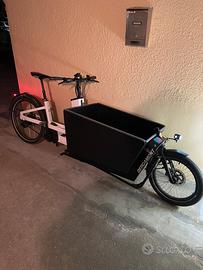 Cargoline. Batteria Bosch 625Wh. Trasmissione automatica (Enviolo) a cinghia. Sellino telescopico. Insieme alla bicicletta: box in legno per il pianale anteriore .