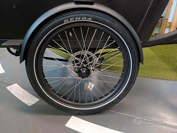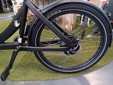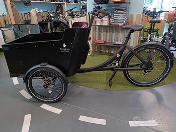 Vendo cargobike a pedalata assistita, motore posteriore, batteria a borraccia, freni a disco idraulici, ammortizzatore di sterzo, box in legno verniciato, nascie con una pachetta da due posti ma si puo' facilmente aggiungerne anche una seconda. Cuscini e capote invernale sono opzionali. La leggera campanatura delle ruote aumenta l'aderenza in curva.