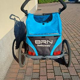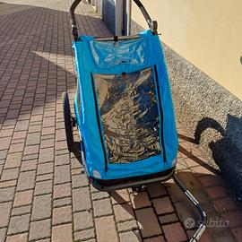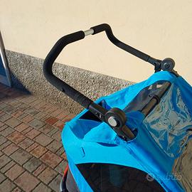Carrellino portabimbi a 2 sedute con cinture di sicurezza a 5 punti, chiusura a sgancio rapido e freno di stazionamento.