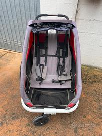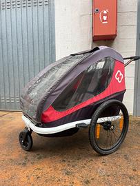 Carrellino rimorchio bici rosso e grigio HAMAX x 2 bambini, puó essere attaccato come rimorchio alla bici o usato come passeggino per 2 bambini.