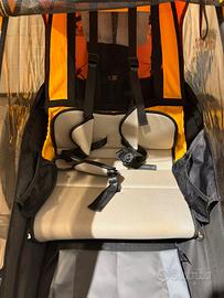 Monoposto, con timone con gancio di traino, gagliardetto di sicurezza, ruota per passeggino e barra di spinta regolabile, copertura contro gli insetti e le intemperie, innovativo sistema di ripiegamento, freno di stazionamento a pedale per bloccare entrambe le ruote, materiale riflettente, indicazioni di altezza e larghezza.