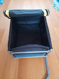 Vendo carrello bici nuovo mai usato completo di gancio traino da fissare al mozzo posteriore della bici(lato opposto al cambio). Portata 30kg,ruote da 20",misure cassone 57cm largh.,74cm lungh.,35cm altezza. L'articolo e'praticamente nuovo quindi il prezzo non e'trattabile.