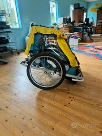 Carrello per bambini collegabile alla bicicletta per trasporto.