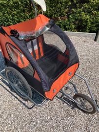 Trasportino da agganciare alla bici, può portare fino a 2 bambini, condizioni molto buone, ha anche la terza ruota per essere utilizzato cone passeggino. Presenti rete antizanzare e protezione pioggia.