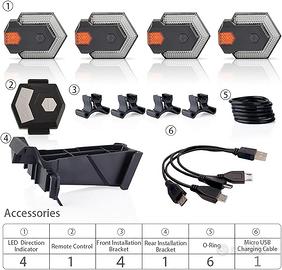 vendo CarryBright CBX4 set di indicatori di direzione anteriore e posteriore, azionate da telecomando wireless intelligente con clacson integrato. Articolo NUOVO, mai utilizzato, nella sua scatola originale e completo di tutte le parti necessarie al montaggio e visibili nell'ultima foto. Le caratteristiche sono le seguenti:
