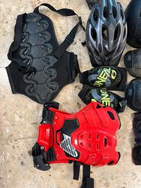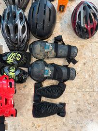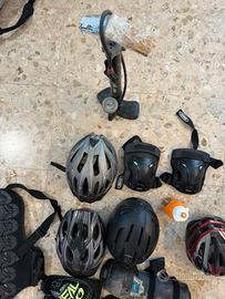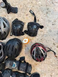 4 caschi usati di cui 1 casco crivit con luce funzionante posteriore, 1 casco Giro, 1 casco btwin a elmetto con attacco gopro, 1 Bell con visiera leggermente danneggiata