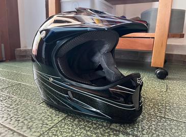 Casco per bicicletta marchio FOX edizone Rampage, nero lucido ottimo stato, usato pochissimo mai caduto, presenti 2 graffietti visibili anche in foto dovute a disattenzioni nel portarlo, interni immacolati e puliti, la sacchetta semplice nera fornita con il casco quando venne acquistato è compresa nella rivendita, insieme al libretto e pezzi di ricambio.