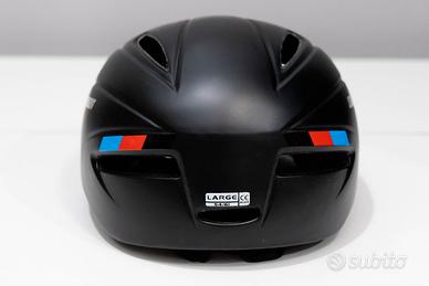 Il casco è pulito, mai subito urti e pronto all'uso. Design moderno e aerodinamico con inserti colorati (rosso/azzurro) sulla parte posteriore.
