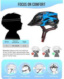 Taglie disponibili per bambini: la taglia S è adatta per teste di dimensioni 50-55 cm, che come guida all'età approssimativa è di 3-9 anni. La taglia M è adatta per teste di dimensioni 54-59 cm, che come guida approssimativa all'età è di 8-15 anni. Misurare la circonferenza leggermente sopra le sopracciglia per assicurarsi di scegliere la taglia corretta.