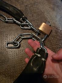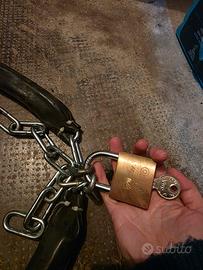 Grande catena antifurto per bicicletta, composta da una catena robusta rivestita da una camera d'aria e da un lucchetto resistente.