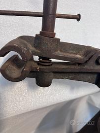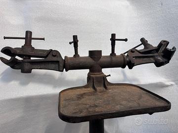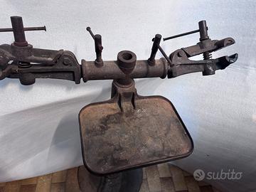 Pesa 60kg L'oggetto nell'immagine e un supporto o cavalletto da riparazione vintage, storicamente utilizzato per la manutenzione di biciclette o motocicli. Caratteristiche Principali Doppio braccio: La struttura presenta due bracci orizzontali dotati di morsetti regolabili tramite maniglie a vite, progettati per bloccare saldamente il telaio di un veicolo. Vaschetta portaoggetti: Sotto i bracci è presente una piccola piattaforma rettangolare, tipicamente utilizzata dai meccanici per appoggiare attrezzi o minuteria durante il lavoro. Base robusta: L'intera struttura poggia su una pesante colonna centrale in ghisa e una base circolare, garantendo stabilità durante le riparazioni. Pezzo unico Costo spedizione da gestire al momento dell’acquisto