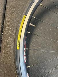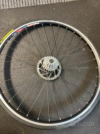 Cerchi bici da corsa usati letteralmente 1 volta per un tratto di strada brevissimo, tutto incluso pignone 9 marce,disci,copertoni, posso anche spedire