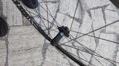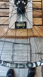 Ruote Dt Swiss XR 1501 boost, canale interno 22,5 qualche leggerissimo segno sui cerchi ma nessuna crepa o danno. Mozzi Sram 900 montati di recente molto scorrevoli, solo quelli costano più di 200 Euro entrambi. Leggerissime, 859G e 756g l’anteriore.
