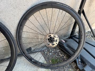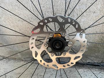 Ruote: Fulcrum Racing 800 DB (Profilo 34mm, Alluminio, Center Lock). • Corpetto: Shimano (11/12v). • Copertoni: Vittoria Zaffiro 25mm (già montati con camera d'aria). • Dischi: 140mm anteriore / 160mm posteriore (già installati). Specifiche tecniche: • Stato: Nuovo (smontato da bici nuova). • Perni: Passanti 12x100mm (ant) / 12x142mm (post). • Tubeless Ready: Cerchi predisposti per conversione tubeless. • Affidabilità: Set ideale per allenamento o uso gravel leggero, robusto e scorrevole. Pronte al montaggio