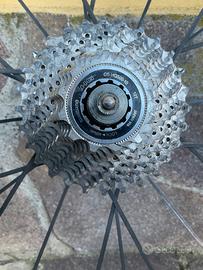Sul cerchio posteriore è montato pignone marca SHIMANO, modello CS-HG500-10