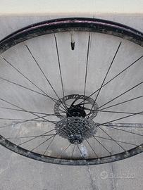 Vendo cerchi Triban Gravel 28", usati in buone condizioni, specifiche 700x23c, ETRTO 23x622, canale da 23mm, quick release 9x100mm/9x135mm, con pacco pignoni Microshift 11 velocità 11-34 e dischi nuovi, tubeless ready nastrate Muc-off