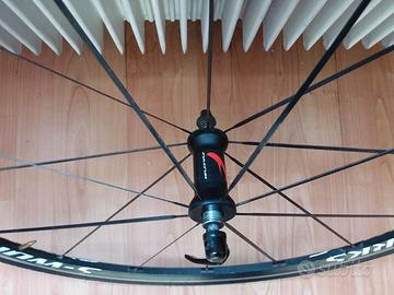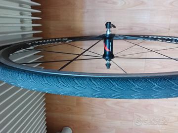 Cerchio anteriore bici da corsa gommato Vittoria Zaffiro 700x25, mozzo Fulcrum raggi piatti ,il cerchio e perfettamente dritto non ha anomalie .