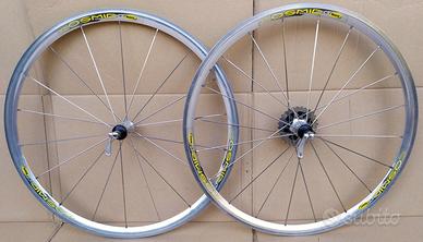 Cerchioni vintage Mavic Cosmic profilo a spalla alta aerodinamici misura 28" per copertoncino, completi da cassetta pignoni Miche da 9 velocità (13-28), puliti ed allineati, senza botte, pronti per essere montati.