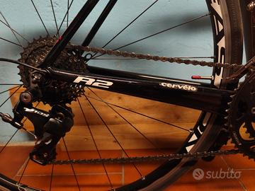 Telaio carbonio, nero metallizzato, leggera e bella da pedalare, cambio Shimano 105, pacco pignoni 11/32, movimento FSA corone 50/34, freni 105, copertoncini cambiati un anno fa', sella SMP Evolution, doppio porta borraccia