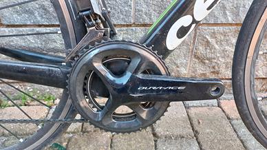Cervèlo R5 2018, taglia 54, montata Shimano Durace Di2 a 11 velocità. Freni rim. Ruote Fulcrum racing zero (tubeless ready). Corone 52-36 e pacco pignoni 11-30. Pedivelle da 172,5 mm. Manubrio da 42 cm e attacco manubrio da 10 cm.