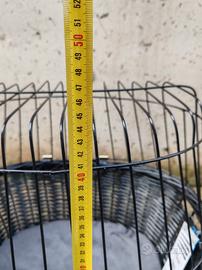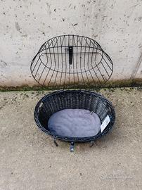 Cestino in vimini nero con gabbietta superiore in metallo nero, ideali per cani di piccola taglia.