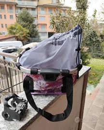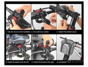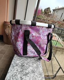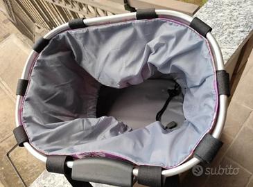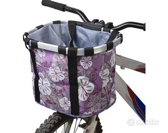 Cestino da bicicletta anteriore con sistema di sgancio rapido: - Tessuto con fantasia floreale viola, rosa e bianco. - Bordi rinforzati. - Manici neri per il trasporto. - Staffa di montaggio/fissaggio inclusa (completa di tutti i pezzi!). Praticamente NUOVO (L 34 x P 28 x H 25 cm)!!! Ideale anche per trasporto di piccoli animali (cani/gatti)! Come da foto.