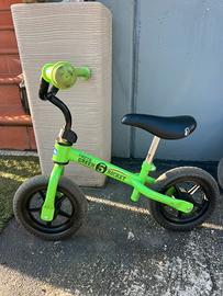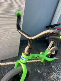 Bicicletta chicco green rocket senza pedali con manubrio e sellino regolabili (peso max 25kg). Segni di caduta sulla parte anteriore e sella con un “buco” su un lato causa caduta