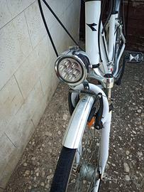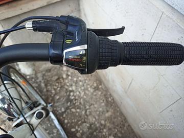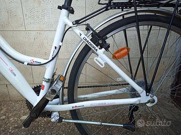 bellissima e elegante Bici city bike donna Diadora fitness 21v Colore bianco Telaio Alluminio saldatura a Tig Forcella Acciaiio ammortizzato Cambio posteriore Shimano TZ50 Cambio anteriore Shimano RS35 Ruota libera Shimano 21 velocità MFTZ21 1428 Guarnitura alluminio Leve freno alluminio Freni V-brake alluminio Cerchi 28” in alluminio argento Sella Touring Diadora made in Italy Bloccaggio collarino in alluminio Manubrio In alluminio regolabile super comfort Tubazione Con sezione wing shape oversized Cavalletto In alluminio Portapacchi posteriore in acciaio con molla Lucchetto antifurto integrato al mozzo Illuminazione: installati faro anteriore e posteriore a batterie, l’illluminazione può essere anche integrata alla dinamo presente nel mozzo shimano Per altre fotografie chiedete, non è possibile pubblicarne più di sei.