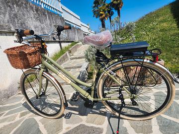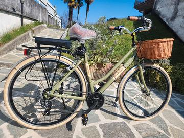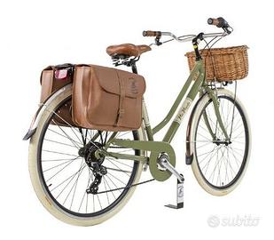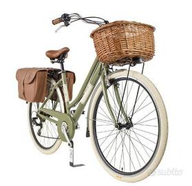 City Bike Canellini "Via Veneto" Prezzo Decathlon (a nome "Dolce Vita"): 349,90€ Taglia 50 per altezze da 170 cm in su Telaio in alluminio Ruote 28" (700 x 35) Cambio TX50 6 velocità Comandi cambio gript-shift 6 velocità Freni V-Brake Alluminio Manubrio in alluminio con piantone regolabile Guarnitura in alluminio con perno a cassetta Luci a led anteriore e posteriore a pila Parafanghi in resina verniciata color cuoio/grigio Portapacco posteriore omologato per seggiolino bimbo Borse similpelle color cuoio (comprese) Cestino in vimini naturale (compreso) Peso circa 15 kg Colore verde oliva