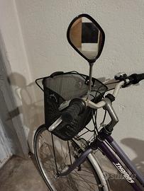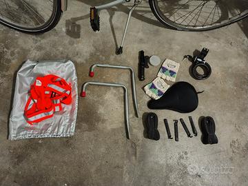 2 camere d'aria, attrezzi per cambio gomme, copri sella morbido, pompa per gonfiare le gomme, catena antifurto con chiave e lucchetto, specchietto retrovisore, campanello, cestino porta oggetti anteriore in metallo e portapacchi posteriore, guanti imbottiti, gilet catarifrangente, cavalletto, 2 ganci in metallo per appendere la bici alla parete. Luci anteriori e posteriori funzionanti.
