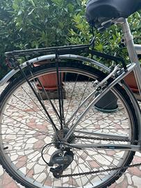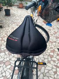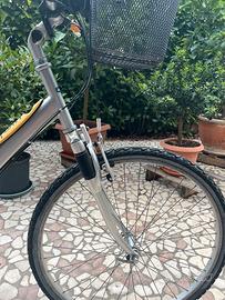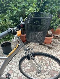 City bike b’Twin della Dechatlon, biammortizzatore antoriore, cambio 3x7 SRAM 3.0, cestino nuovo b’twin, e coprisella in gel per tratto più confortevoli, cerchi da 29’, anno 2018