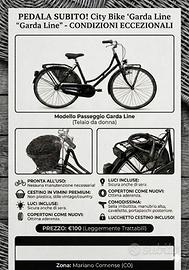 Vendo splendida bicicletta da passeggio (City Bike) modello Garda Line Lady, color bordeaux metallizzato. La bici è in condizioni estetiche e meccaniche eccellenti, conservata con estrema cura e pronta a pedalare subito. Accessori: Cestino anteriore in vimini (colore coordinato), portapacchi posteriore robusto con reti protettive laterali. Comfort: Sella ergonomica imbottita e manubrio alto per una postura comoda e schiena dritta. Sicurezza: Luci anteriori e posteriori funzionanti, campanello cromato e freni perfettamente regolati. Stato: Copertoni in ottimo stato con battistrada come nuovo. Inclusa catena antifurto riposta nel cestino. RITIRO: Solo a mano presso Mariano Comense (CO). Non effettuo spedizioni. Prezzo: €120 leggermente trattabili
